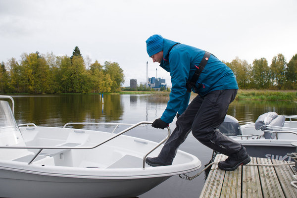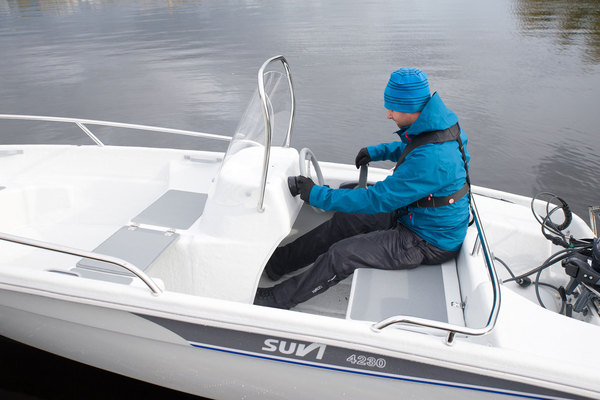 Lastin kanssa 4230 R tuntuu myös varsin vakaalta menijältä. Sama on vielä kahden hengen kuormallakin, kun toinen istuu keulassa. Matkustaminen on myös suhteellisen toimivaa, kunhan on pukeutunut tarvittaessa lämpimästi ja veneeseen on otettu lisävarusteiset kaiteet. Niistä saa hyvin kiinni, mutta ilman niitä aallokossa voisi olla vähän orpo olo.