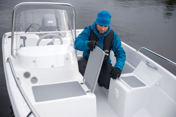 Tässä 4230:ssa säilytystilaa onkin tosi vähän, vain peräpenkin alla. Sielläkin tilaa vievät muun muassa bensatankki ja veneilyssä pakolliset varusteet. Pieni vene tarvitsee paljon ilmaponttoneita kelluakseen neljän hengen kuormalla, joten säilytystilaa esimerkiksi keulaan ei ole jäänyt.
