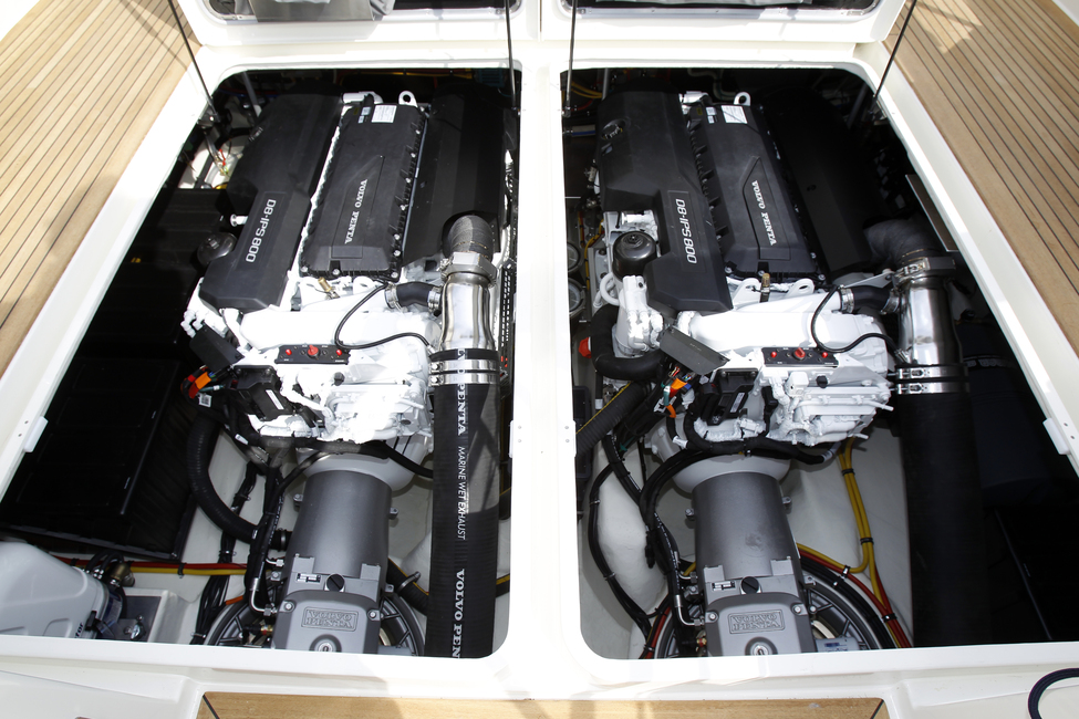 Pidennys on tehty runkoon sopivasti moottoritilan kohdalle. Sen myötä on saatu Volvo Pentan jättimäiset IPS 800 -moottorit mahtumaan kyytiin. Nimestä huolimatta tehoa on ”vain” 600 hevosvoimaa per kone, mikä on sekin kyllä erittäin paljon. 1200 hevosvoimaa 12 000 kilon painoisessa veneessä on matkaveneelle ihan kova teho-painosuhde.
