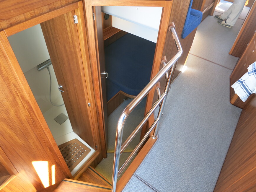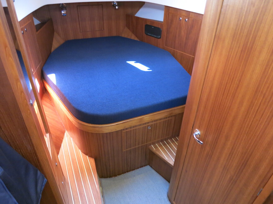 Edessä makuuhytti on varustettu myös omalla WC:llään ja suihkullaan. Parisängyn lisäksi on yhden hengen pistopunkka poikittain ohjaamon alla. Yhteensä veneessä on siis makuupaikat kuudelle: kahdella parisängyllä ja kahdella yhden hengen pistopunkalla.