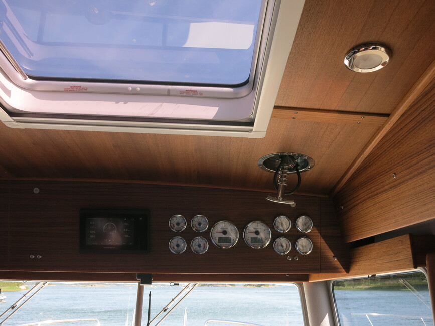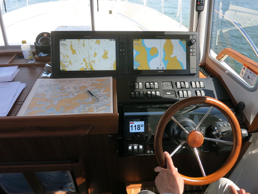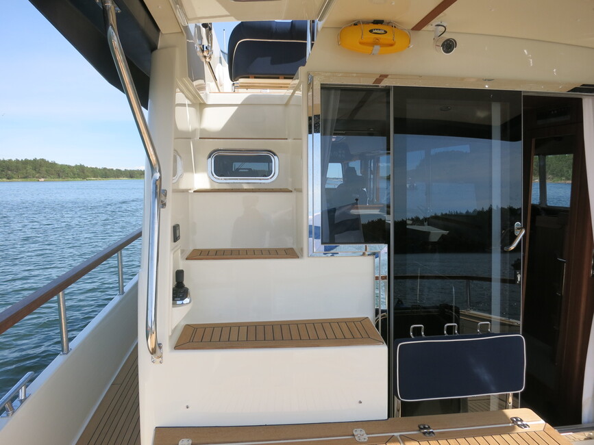 Flybridgelle mennään kunnon portaita pitkin, eikä mitään tikkaita. Kulku on portailla mukavaa ja turvallista. Sen sijaan itse ohjaamo on kyllä turhan pieni, vain katon takaosan pituinen. Siellä ajaessa tuntuu hassulta, miten ollaan varsin perällä veneessä. Ensin hytin katto jatkuu pitkälle edessä ja sen jälkeen veneen keulaosa vielä pidemmälle.