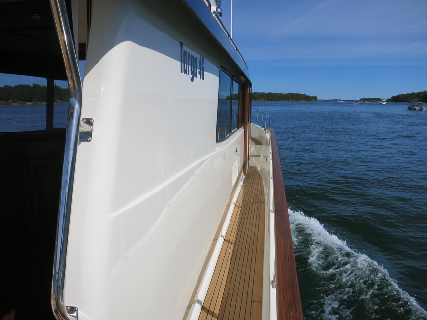 Jos nyt jotain miinusta, niin vasemmalle takaviistoon näkee todella huonosti. Takanurkkaan pidennyksen myötä tullut ikkunaton alue blokkaa näkyvyyden. Muutenkin todella edessä ajaminen ja pitkän peräosan mukana vetäminen tuntuu hieman hassulta. Näitä voi korjata ajamalla juhlavasti flybridgellä. Siellä tuuli tuivertaa ja näkyvyys on eeppinen. Venettä pääsee flaikkarilla käskemään melkeinpä sen takaosasta, jolloin sen kulkua pääsee osin näkemään kuin lintuperspektiivistä.