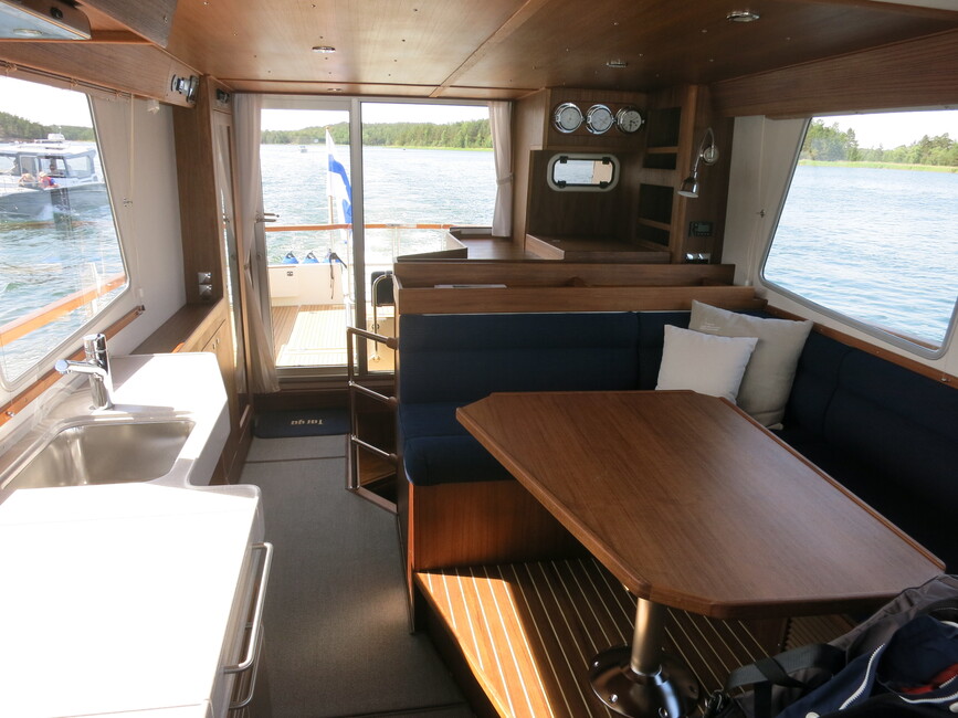 Koeajamassamme veneessä lisäsentit oli kaikki käytetty hyttiin. Ulkoa katsoenkin sen huomaa: takanurkkien ikkunaton alue on aika pitkä. Muutenkin pitkänomainen hytti tuntuu erityisen pitkältä ja siksi myös hieman kapoiselta. Paapuurin puoleisessa takanurkassa on hyllykköalue, jonne ulottuu lähinnä sohvalta polvillaan kurotellen.
