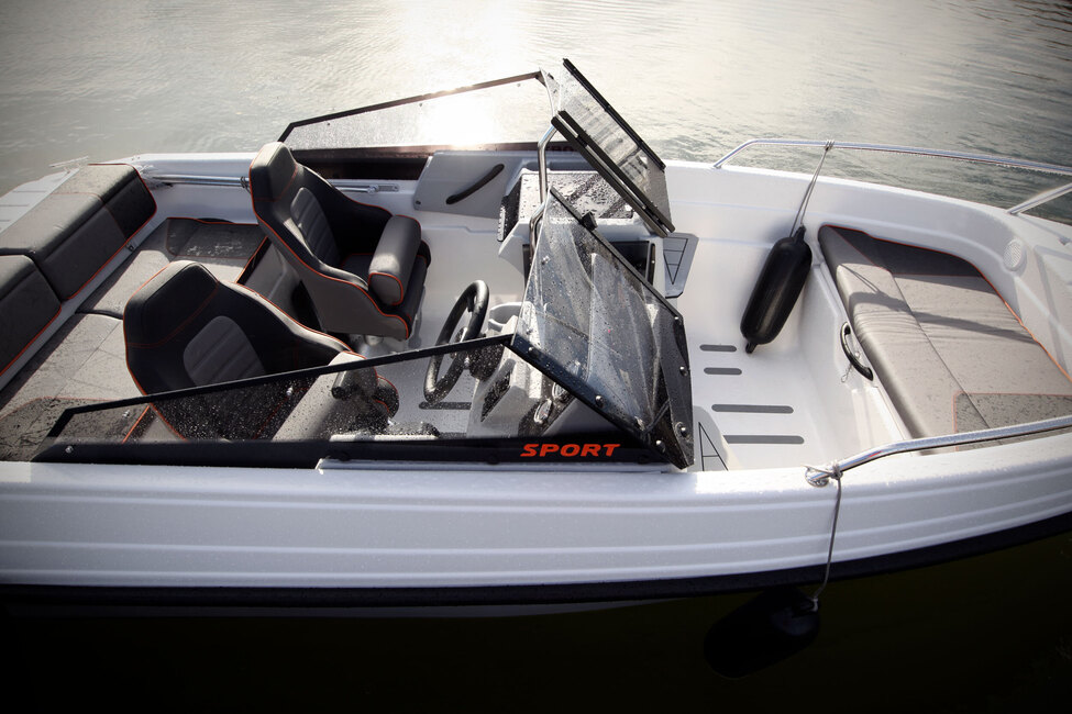 Kuljettajalle ja kartturilla on kuppi-istuimet ja veneen perässä on sohva, jossa mahtuu istumaan kolme aikuista. Lisäksi istua voi halutessa keulan leveällä kaksi aikuista vetävällä sohvalla, jonka alta löytyy iso säilytyslokero.