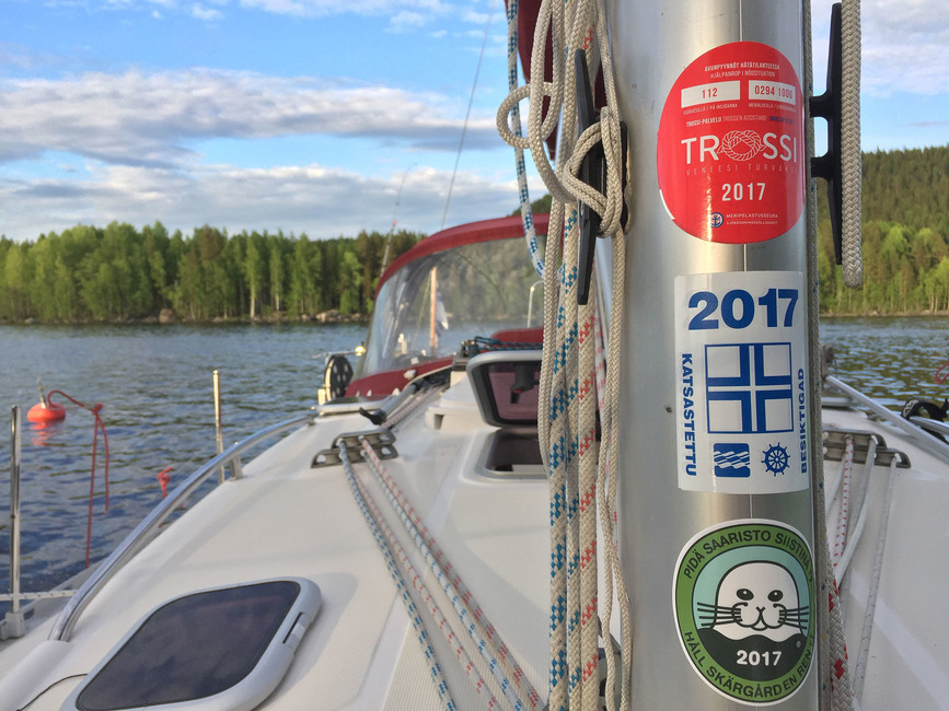 Omaan keväällä päivitettävään varustukseen kuuluu vielä kaksi tarraa, vaikka ne eivät pakollisia olekaan. Pidä Saaristo Siistinä ry:n Roope-tarra on merkki jäsenmaksusta, jolla rakennetaan veneilijöille mm. jätepisteitä, kuivakäymälöitä, astianpesupaikkoja ja käymäläjätteiden imutyhjennysasemia.