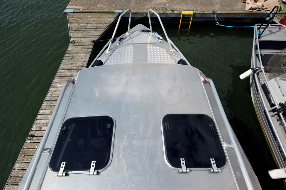 Voyagerin kansi on selkeän muotoinen ja veneeseen on helppo astua. Perään mennään kylkien kautta, mutta kulkeminen on vankkojen tartunkahvojen ansiosta helppoa. Asiaan vaikuttaa myös se, että edes painava mies ei saa perään hivuttautuessa venettä juurikaan kallistelemaan.