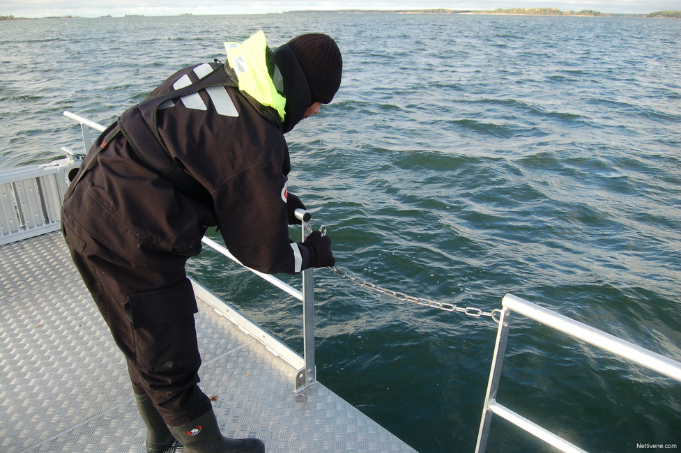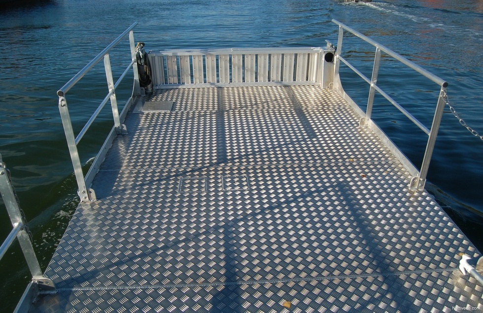 Suosituin on ollut tämä nyt koeajettu 6-metrinen Alpo Classic. Kahden tonnin kantavuudella tähän menee juuri ja juuri normaali henkilöauto. Classicista on myös 8- ja 9-metriset versiot, joihin mahtuu jo isompikin paku tai traktori. Isompiin malleihin saa helpommin mahtumaan myös suojaisan kabiinin, mikä saariston syyssäillä on todella tervetullut.