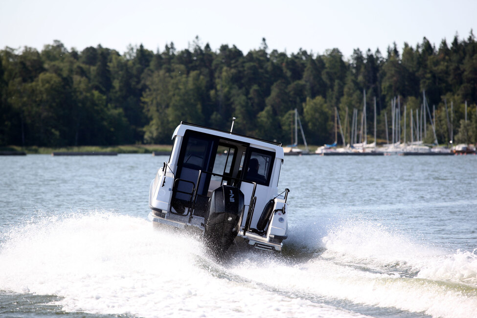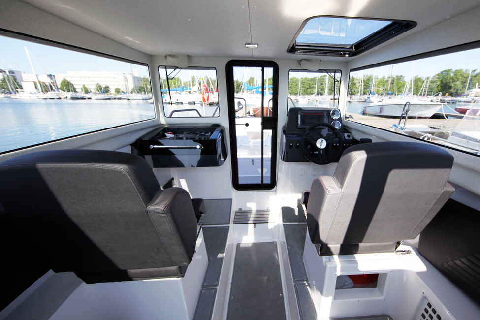 Selkeiden linjojen ja isojen ikkunapintojen ansiosta näkyvyys sisältä on hyvä, vaikka kuski istuisi ohjastaessaan venettä. Kuskin tähystysluukku on niin iso, että harteikkaampikin kapteeni mahtuu työntämään päänsä ulkoilmaan.