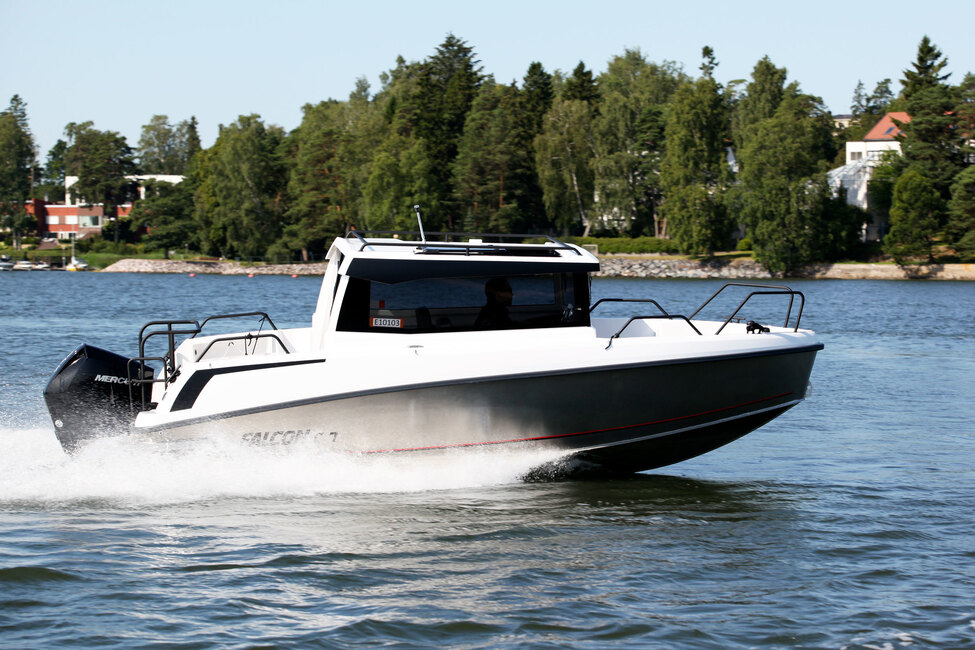 Ajossa Falcon tuntuu asialliselta, suorastaan helpolta kumppanilta. Se nousee liukuun nopeasti koeajoveneen moottorisuosituksen yläpäähän sijoittuvalla 175-hevosvoimaisella V6-Mercurylla, vaikka veneessä on kyydissä maksimimäärä eli seitsemän aikuista.