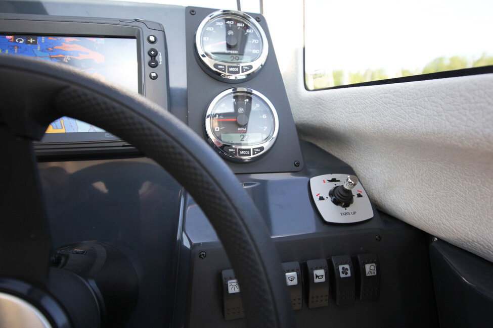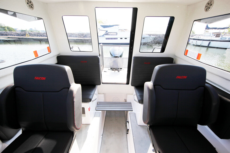 Kuskin paikalla asiat ovat hyvin, tosin istuimeen kaipasi pituussäätöä. Kojelaudan keskellä on paikka karttaplotterille ja sen vieressä oikealla on pyöreät mittarinäytöt nopeudelle ja moottorin kierrosluvulle. Falcon C 7:ssä on vakiona trimmitasot, joita ohjataan manuaalisesti joystickillä. Lisävarusteena veneeseen saa automaattisen trimmin.