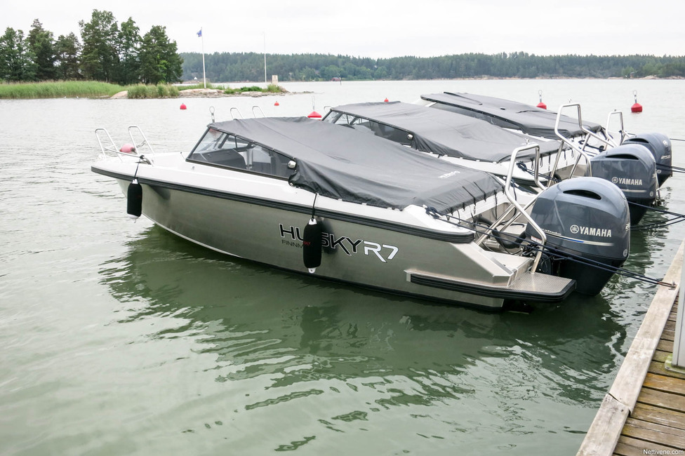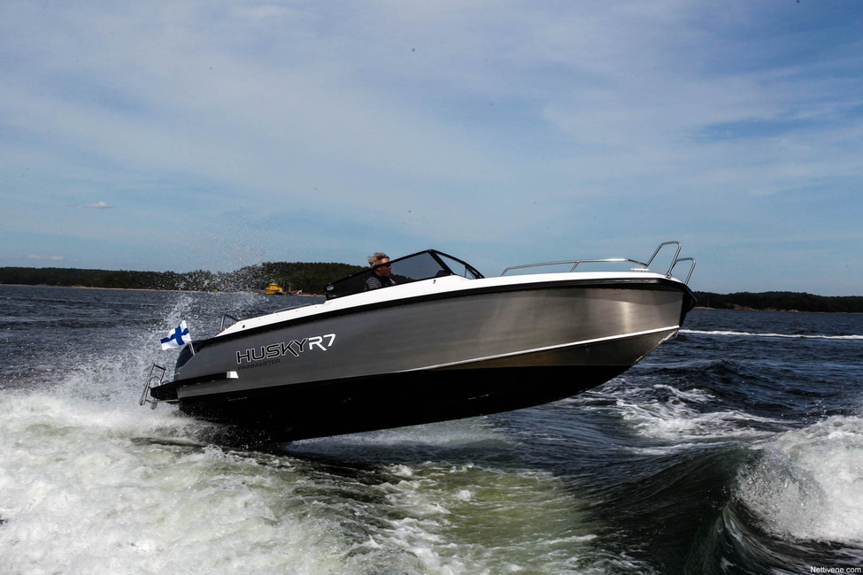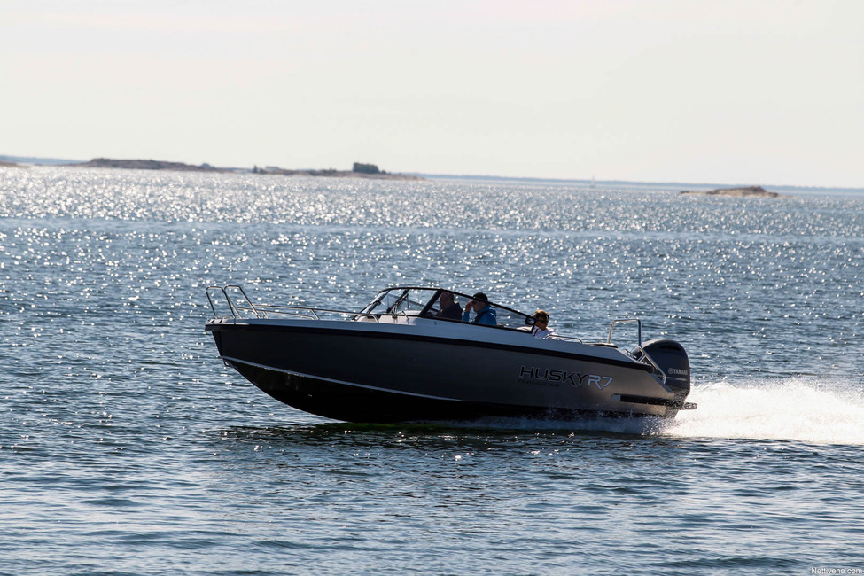 Vielä tymäkämpää löytyy malliston toisesta päästä, Husky R8. Se kyllä isottelee nimellään, sillä pituutta on ”vain 7,55 metriä”. Pyöristyy se kyllä kahdeksaan, mutta niin melkein pyöristyy hintakin 300-heppaisen moottorin kanssa, sen verran yli 70 000 euron tässä pyöritään. Alumiinisesta avoveneestä!