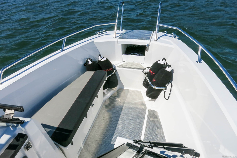 Keulakannella on hyvä kaidevarustus, joten kyytiin pääsee sieltä helposti. Ulkopuolelta katsottuna huomio kiinnittyy jykeviin törmäyslistoihin eri puolilla veneen kylkiä. Husky on selvästi tehty olemaan säikähtämättä käyttöä, kuten hintavan alumiiniveneen kuuluukin.