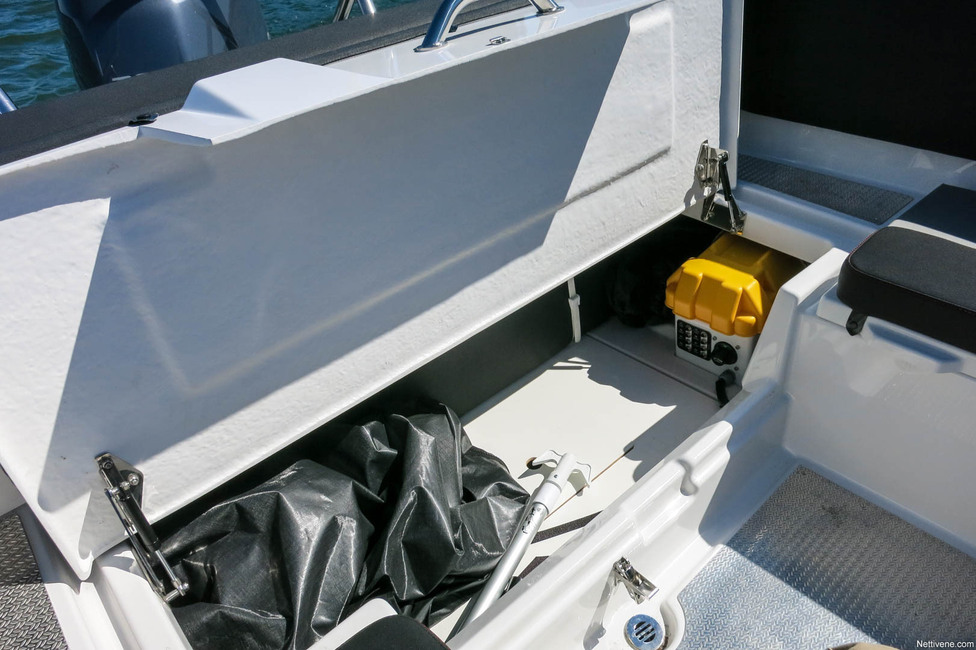 Varsinkin huonolla kelillä takaosa on ymmärrettävän suosittu paikka, kun siellä on vakiona myös kuomu. Kuskilla on tuulilasinpyyhin ja pulpettien välissä kunnon kaksiosaiset ovet. Näin venettä voi käyttää myös vaihtelevan kelin yhteysveneenä, jos ei kaipaa koppivenettä, vaan kesäkelien avointa kyytiä.