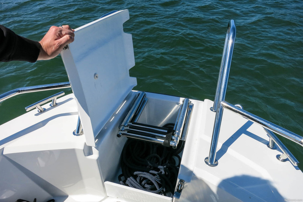Vakiona varsin tyhjään avoimeen keulaa voi lisävarustella esimerkiksi säilytyslaatikon, joka päälle saa istuimen. Se voikin tulla tarpeeseen, jos haluaa mahduttaa sallitut kahdeksan henkeä kyytiin. Eri asia, löytyykö lähipiiristä ihmisiä, jotka nauttivat vauhdikkaan bowriderin keulassa matkustamisesta.
