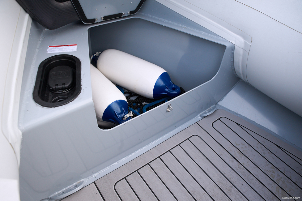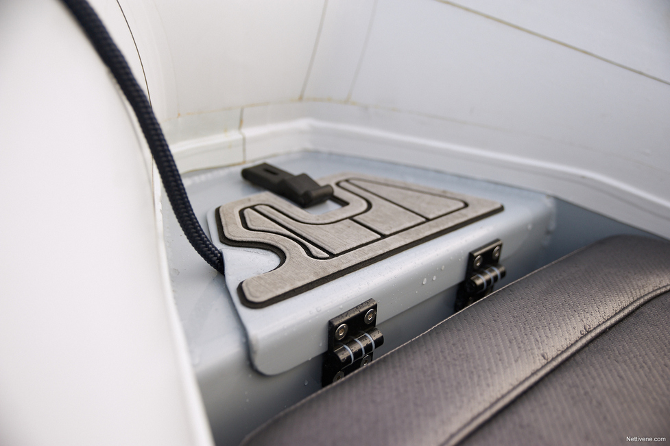 Mainittu pienempi säilytystila keulassa johtuu siitä, että bensatankki ja sen täyttö on veneen keulaosassa. Jännä ratkaisu, joka ainakin tekee hyvää painonjakaumalle. Keula ei nouse yhtä helposti tuulen vietäväksi, mikä on joidenkin varsinkin pienempien RIB-veneiden ongelma.