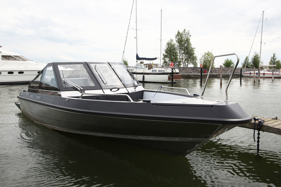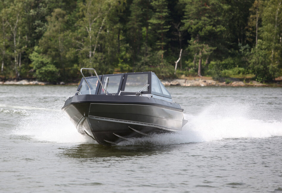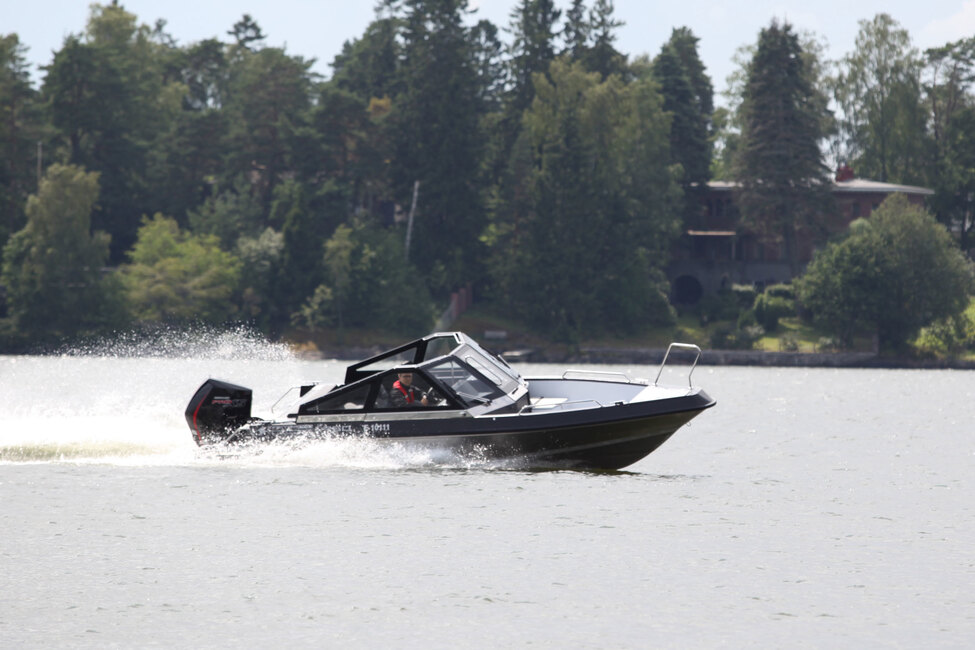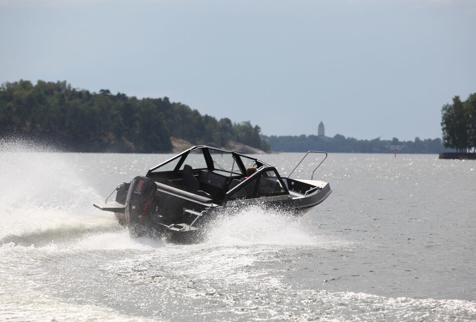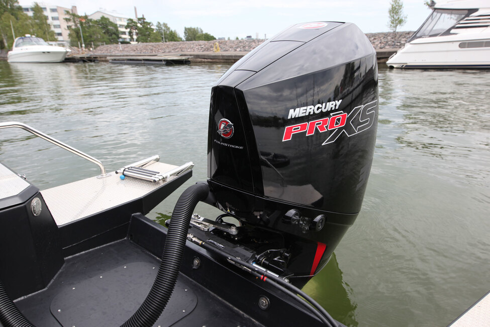Moottorin teholukemaksi voi valita 150-300 hevosvoimaa. Koeajoveneeseen valittu väkivahva 300 hevosvoiman vaihtoehto takaa, että painavan lastin ja ihmismäärän kanssa vene liikkuu jouheasti ja halutessa rivakasti.