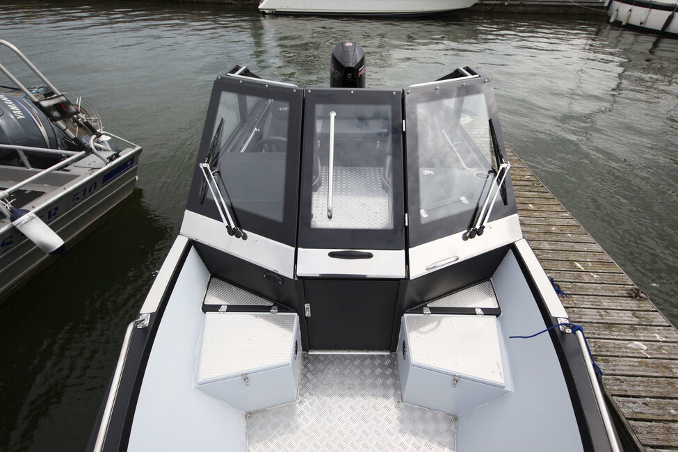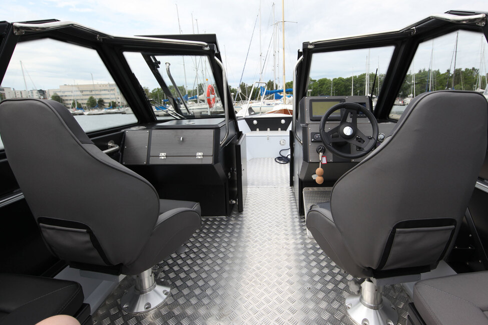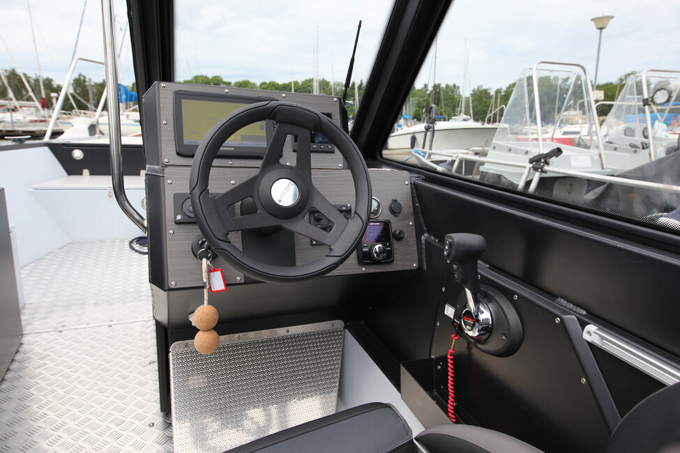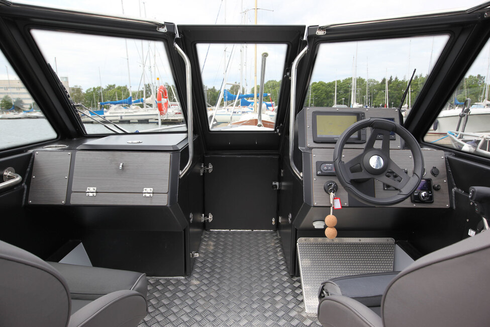 Master Pro 750:ssä on keskellä venettä iso tuulilasi, joka kiertyy sivulle suojaamaan sekä kuljettajaa että kartturia. Kookas lasi suojaa kovemmassa nopeudessa tuulelta ja pisaroilta toki myös takana u-muotoon asetetulla sohvalla matkaajia. Lasin karmiin saa viritettyä ohjaamoa suojaavan ajokuomun, joka on vakiovaruste.