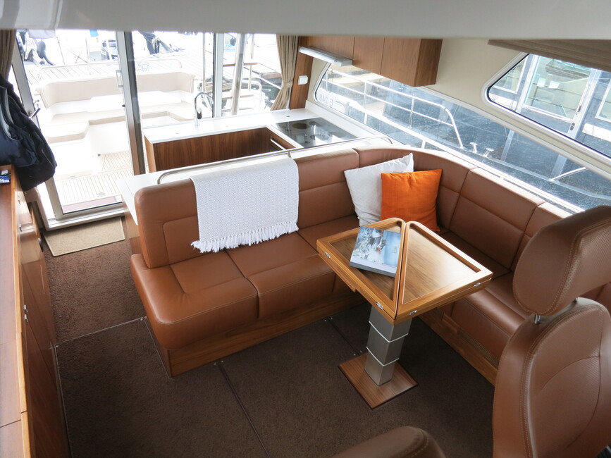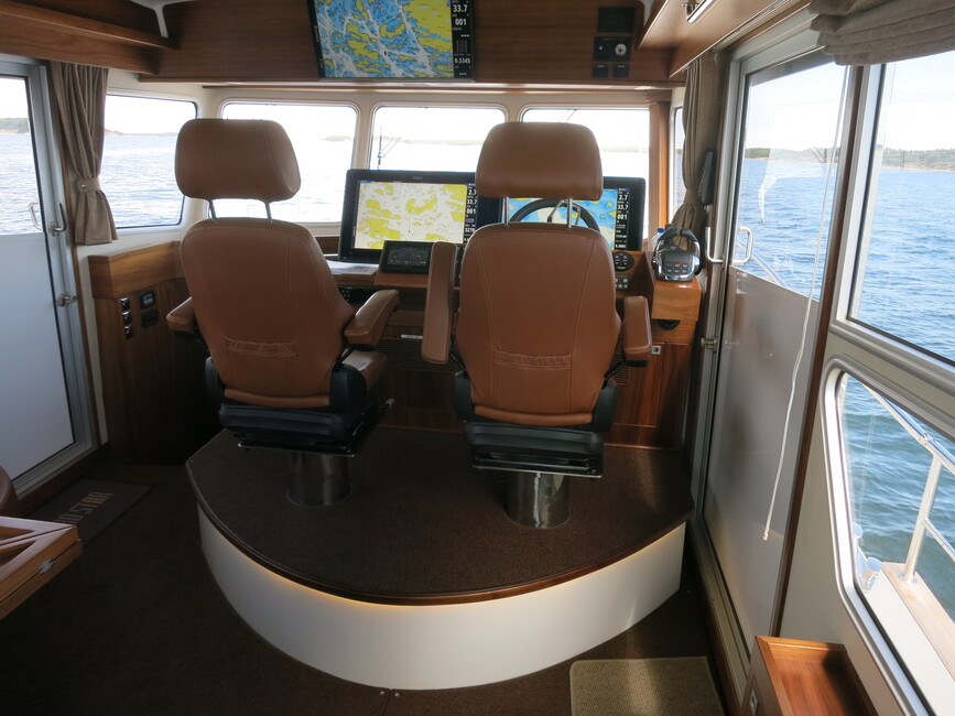 Sisätiloissakin huomio kiinnittyy ensimmäiseksi kipparin paikkaan. Komentosilta on nostettu hieman ylemmäs lattiatasosta, ja siinä on kaksi huippuhyvää istuinta. Näiden ympärillä tuntuu olevan melkeinpä hukkatilaa. Hyvänä puolena matkustajat pääsevät helposti kulkemaan ohi kuskia häiritsemättä. Toisin kuin muissa tällaisissa veneissä, jopa styyrpuurin puoleinen sivuovi aukeaa niin isosti, että kuskin takaa pääsee liikkumaan sivukannelle.