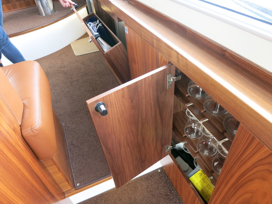 Styyrpuurin puoleisella sivulla käytävän varrella on kaappitilaa, jossa korostuu veneen asiallinen merikarhumeininki. Mitään viinikaappeja tai Pleikkareita ei ole, mutta merikartoille suunniteltu lokero kyllä löytyy.