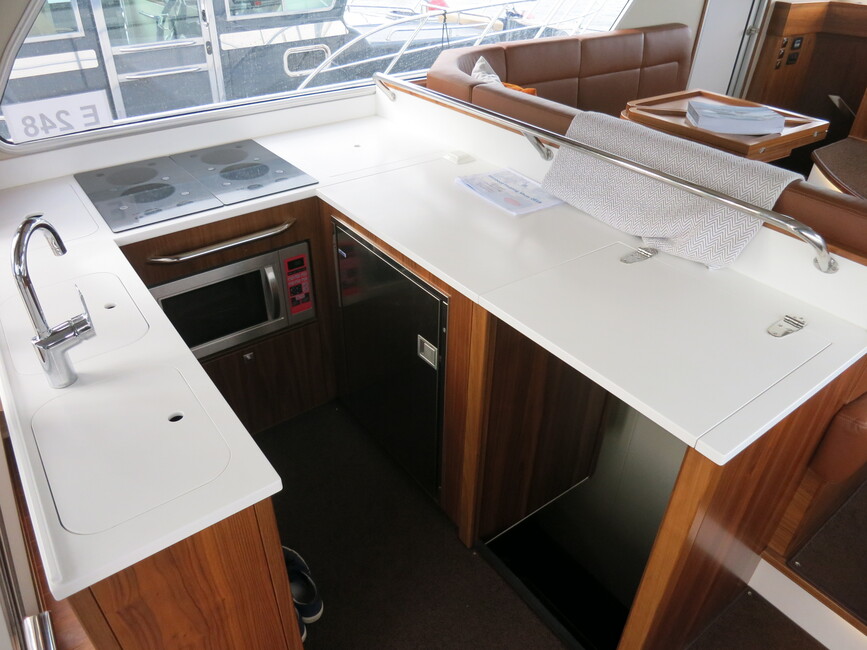 Keskellä salonkia on sohva-/ruokailuryhmä. L-muotoisen sohvan lisäksi keskellä olevan pöydän ääreen voi tehdä mieli asetella irtotuoleja, jotta tilaan saa kunnon kattauksen. Perässä on kunnon keittiösaareke: vakionakin jo neljän levyn hella, tuplalavuaari ja jääkaappi-pakastin. Lisähintaan saa liesituulettimen, mikron ja Iittalan astiaston. Astianpesukone jää silti puuttumaan.