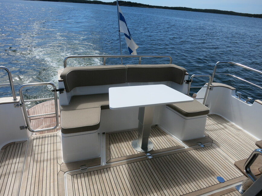 L-sohva on aika ”must”. Sen muotoilu suosii ihan ryhdikästä istumista enemmän kuin loikoilua tai ylpeänä huvijahteilijana röhnöttämistä. Pikku tarjoilut tai barbequet taas luonnistuvat, kun valitsee lisävarusteista jääkaapin ja grillin. Toinen vaihtoehto on niiden sijaan aurinkopatja.