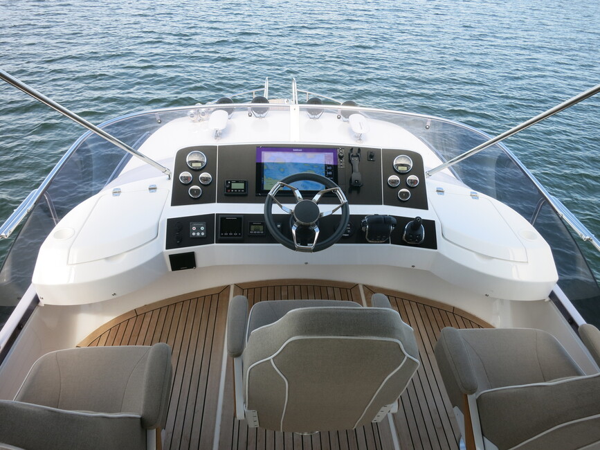 Yläohjaamo ei silti selkeästi ole tämän veneen ykköspanostus. Sen huomaa siitäkin, että hytin koko kattopituutta ei ole käytetty siihen. Flybridgen eteen jää vielä puolisentoista metriä tilaa, jossa on muun muassa valoja. Tämä vene onkin suunniteltu käytettäväksi myös pimeillä syysmyrskyillä.
