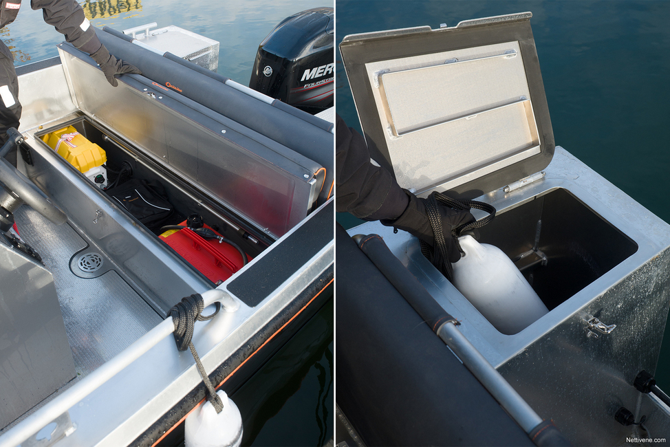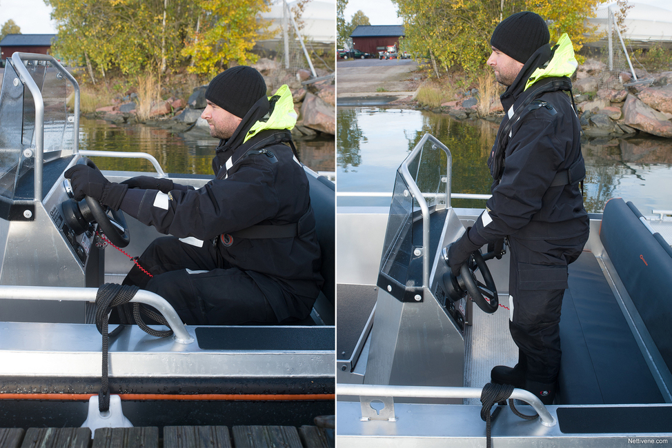 Vakauden huomaa heti kyytiin astuessa. Kallistelua toki on, mutta vähemmän kuin alle viisimetriseltä veneeltä yleensä odottaisi. Perhe- tai kalastuskäytössä tällainen vakaus on oikein tervetullutta. Enimmillään saimme kolme äijää toiselle laidalle keikkumaan, ja yhä jäi reilu kolmekymmentä senttiä laidan ja vedenpinnan väliin. Tässä auttavat myös veneen turvallisen korkeat laidat.
