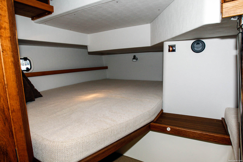 Edessä olevaan makuuhyttiin taas mennään avaamalla iso karttapöytä ohjaamon keskeltä. Salaluukun avaaminen voi olla hauska yllätys vieraille, jotka luulivat jo nähneensä koko veneen… Etuhytissä on V-kirjainta muistuttavassa muodossa kaksi sänkyä ja keskellä seisomakorkeus.
