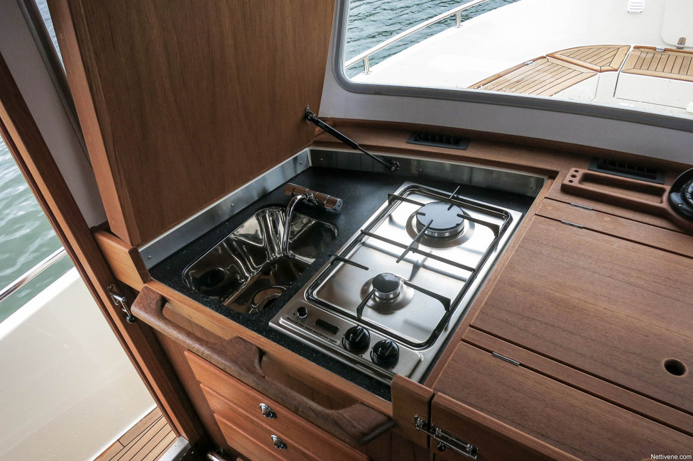 Pentterin sijainti on yhtä aikaa hyvä ja vähän hassu. Ohjaamon etukulmassa karttapöydän avaamalla löytyvät hana ja liesi. Vieressä ajetaan venettä, ja tässä pöydän toisella puolella voisi periaatteessa samaan aikaan kokkailla.
