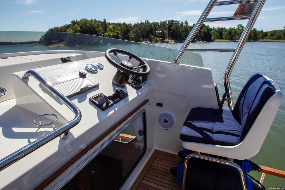 Yläohjaamossa näkösuojan lisäksi puutteellista on myös tuulensuoja. 30 solmun vauhdissa korvissa humisee aika tavalla, joten mieluummin sieltä ajelee noin 20 solmun vauhteja. Ajoasentokaan ei ole huippuluokkaa. Ratti jää vähän kauas ja oikealle kädelle ei ole luontevaa paikkaa, vaan se osuu targakaaren juureen.