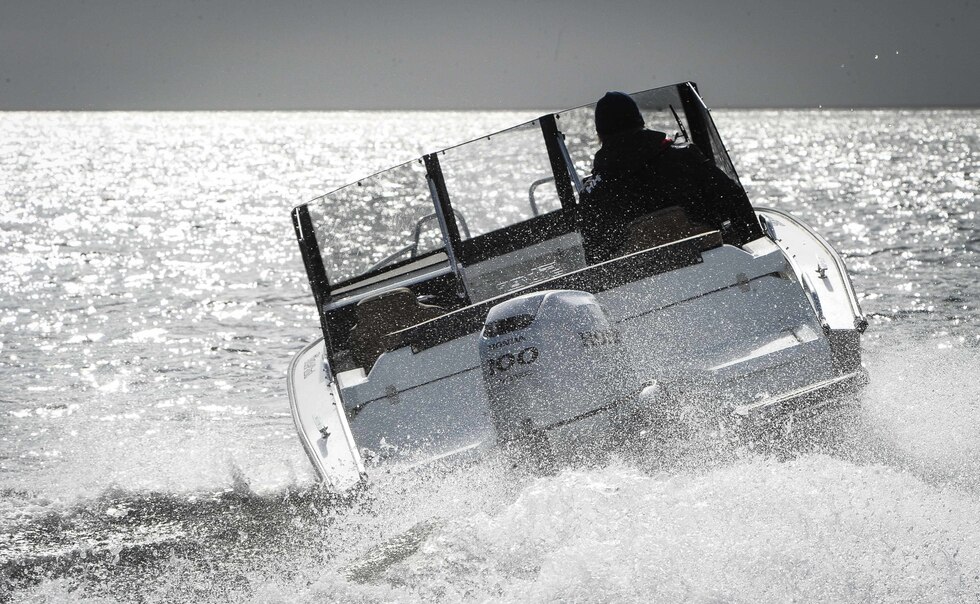 Mutta kun meri heittää ärräpäitä on meno ehkä hieman vähemmän kuivaa kuin aikaisemmin. Myös trimmitasoille, jotka kannattaa ottaa lisävarusteena, tulee selkeästi silloin käyttöä. Toisaalta sivulasit tarjoavat nyt aikaisempaa parempaa suojaa. Sitä tarvitaan koska sileä pohja heittää sivuille melkoiset roiskeet. Nousulistoja on tästä rungosta turha etsiä.