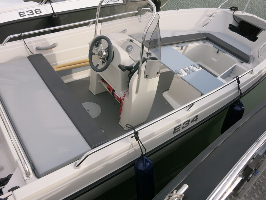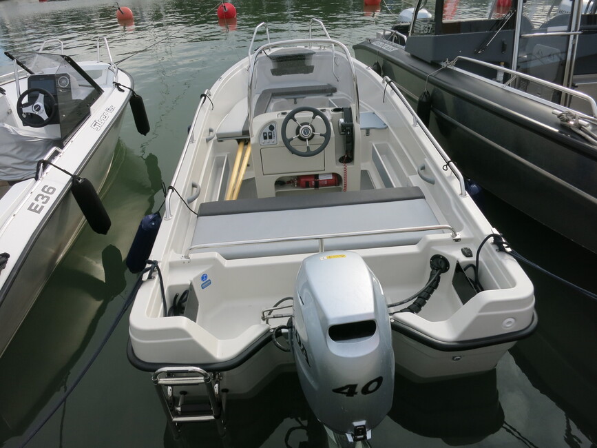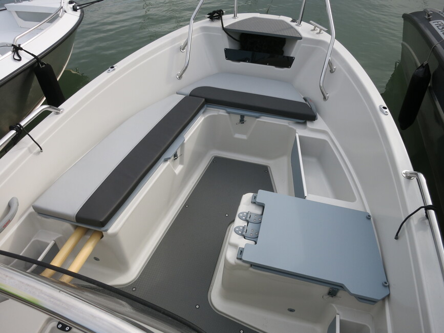 Uutena mallina tässä kokoluokassa on tarjolla myös keskipulpettiversio 450 CC. Aiemmin 475:n on saanut sellaisella varustettuna, mutta nyt keskellä pääsee ajamaan pykälää pienemmässä. Idea kuulostaa hyvältä. Pienemmässä veneessä paino tuntuu vielä enemmän, jolloin yksin ajaessa on mukavinta saada paino veneen keskilinjalle.