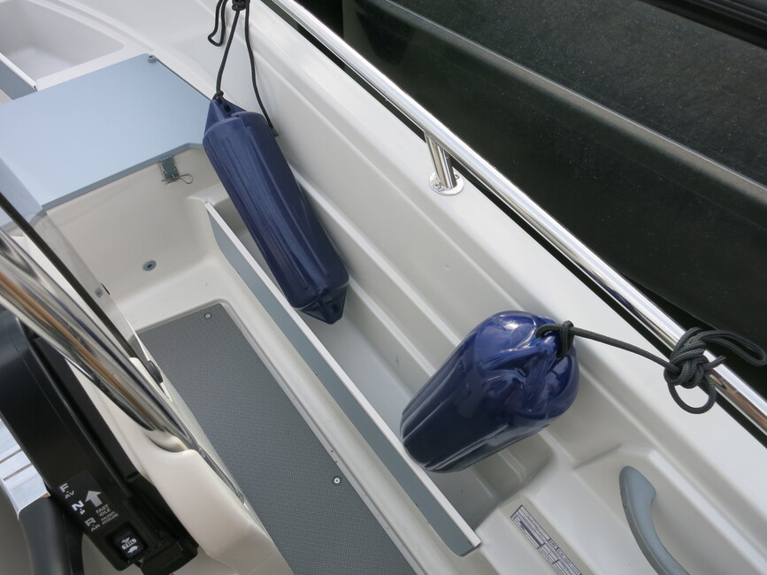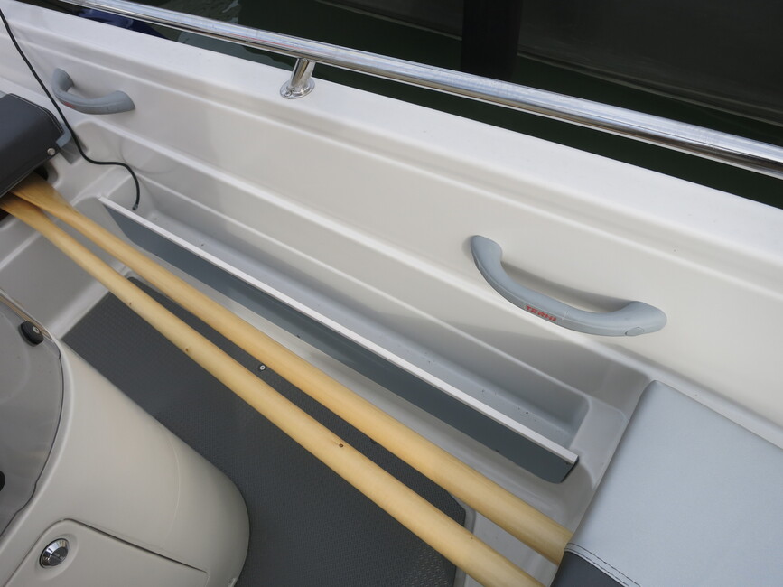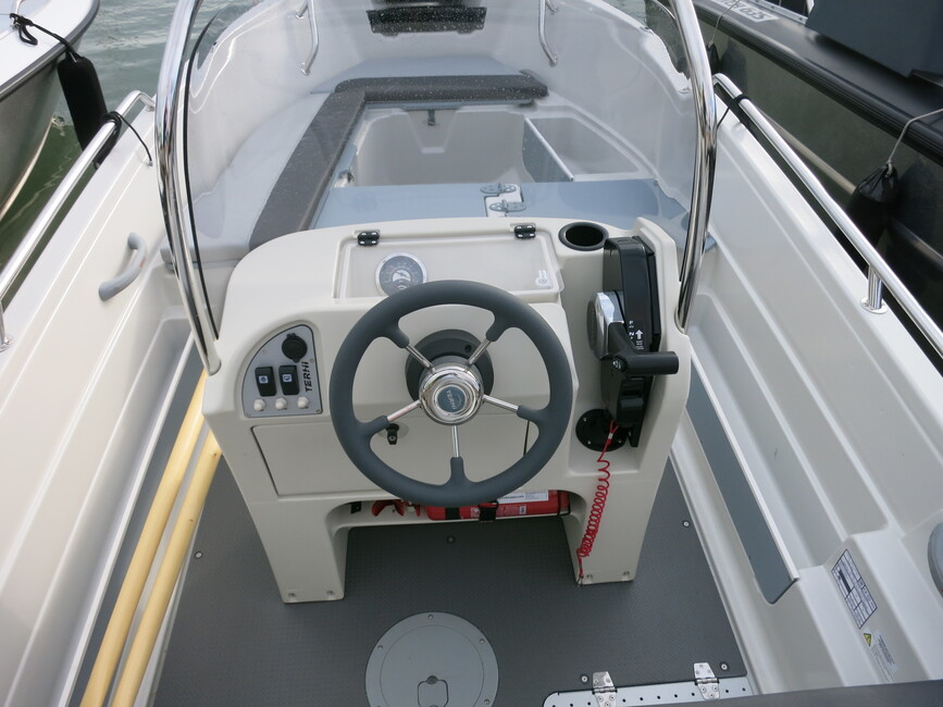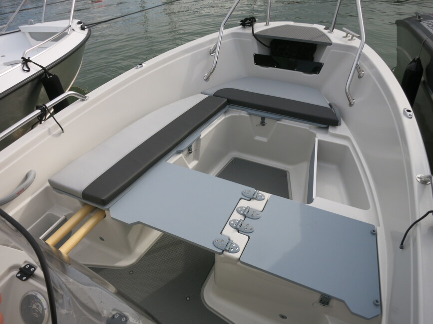 Tilankäyttö lähtee keskellä olevasta pulpetista, jonka voi kiertää molemmilta puolilta. Takapenkki on leveä kolmen istuttava, ja venettä ajetaan sen keskeltä. Penkin alta löytyy iso tavaratila. Se ei näköjään pysy aivan kuivana.