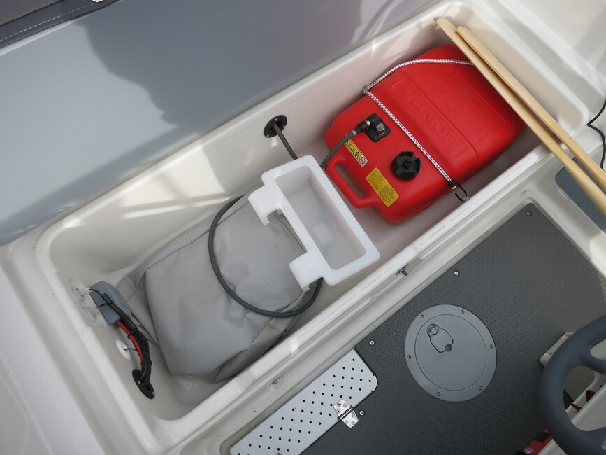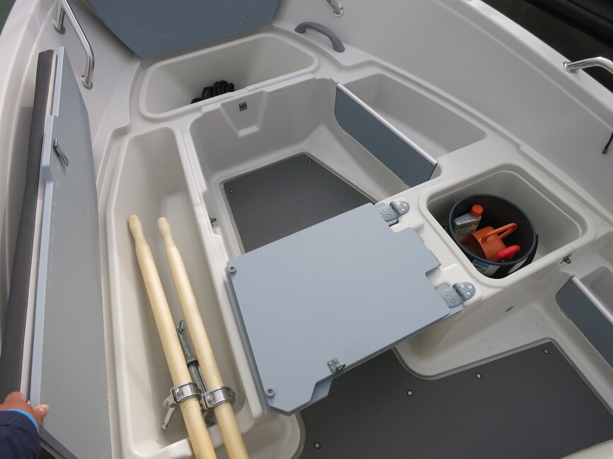 Kätevästi kannellista ja riippulukoilla lukittavissa olevaa säilytystilaa on veneen keulaosassakin penkkien alla aika mukavasti. Vasemman eli paapuurin puoleinen on hieman pitkänomaisempi vaikka kalakamppeille. Hassuna ominaisuutena sinne voi myös laittaa airojen päät ja lukita ne veneeseen. Lisävarusteiset airot ja soutumahdollisuus keulasta voivat olla kätevät moottorin suojelemiseksi, jos tarvitsee mennä todella matalissa vesissä.