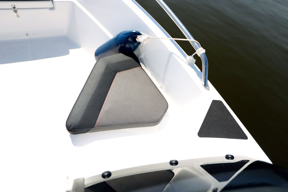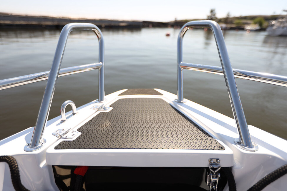 Veneeseen on helppo astua keulan leveän liukuesteellä varustetun askelman ansiosta. Mukava on myös, että 54BR:n molemmilla sivuilla on laita-askelmat helpottamasta sisään astumista, kun vene on laiturin kylkikiinnityksessä. Veneen kaiteet, knaapit ja kansiheloitus ovat vakiovarusteita.