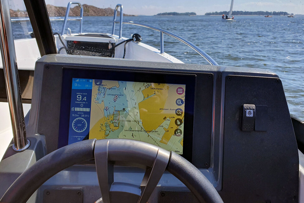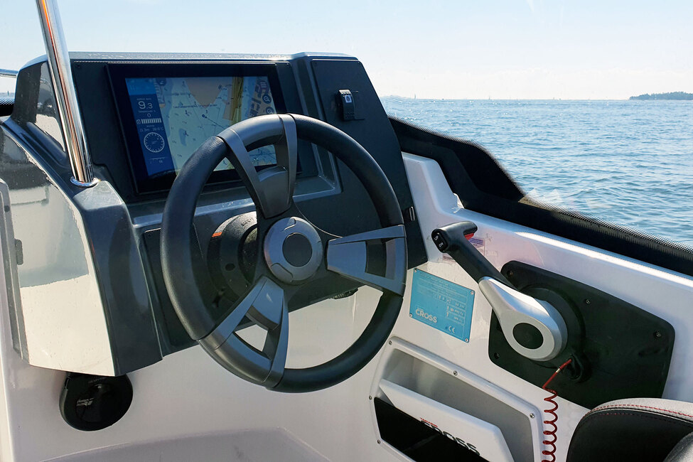 Veneen paras vakiovaruste on helppokäyttöinen ja monipuolinen Cross Q infotainment -järjestelmä, joka yhdistää muun muassa merikartat sekä elektronisen navigoinnin yhdelle 10 tuuman näytölle. Kokemuksemme mukaan muun muassa Bustereissa ja muissa Yamarinin veneissä käytössä oleva Q on käyttöominaisuuksiltaan helpoin tarjolla oleva järjestelmä navigointiin.