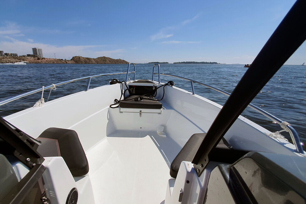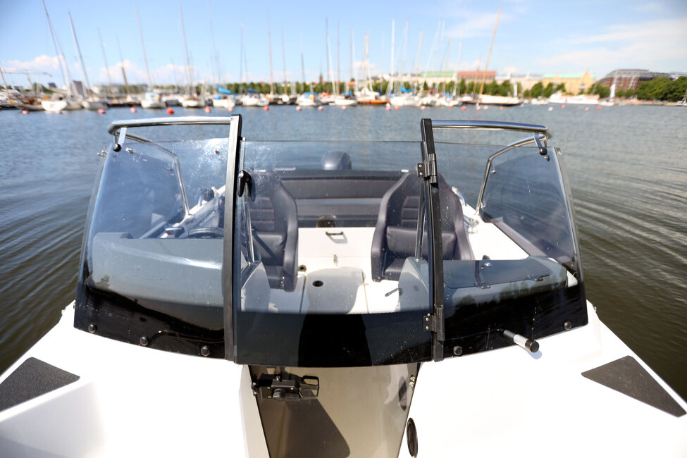 Kuuden hengen veneessä on paikkoja edessä kolmelle, joten vaihtoehtoisia istumapaikkoja löytyy halutessa. Kovassa kelissä matkustajat istuvat mielellään veneen keskellä sijaitsevan läpikuljettavan ison tuulilasin takana eli offshore-istuimet ja takasohva ovat varmasti kovemmassa käytössä kuin etuosa istumapaikat.