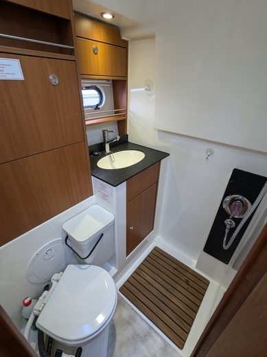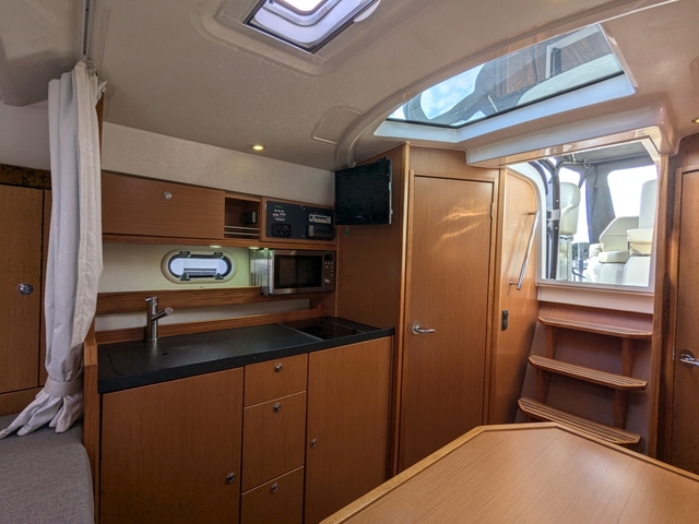 Mid cabin on ovella varustettu tilava ja kajuutta, johon saa kulkea selkä suorana, eli tilaa on.