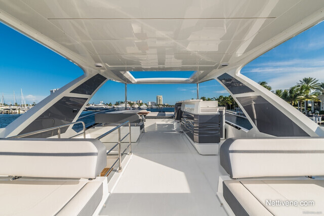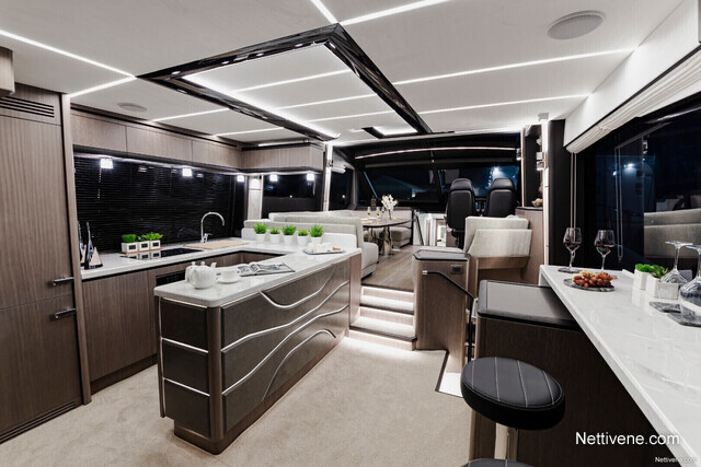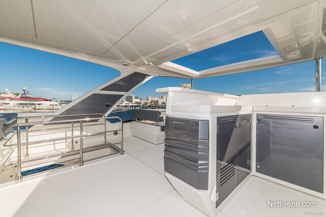 Ulkokannella vieraat voivat rentoutua useassakin oleskelualueessa, joita löytyy pitkin venettä. Muun muassa aurinkokansi voidaan muuntaa istuskelualueeksi napinpainalluksella kun taas kookas flybridge on tilava suuremmallekin vierasporukalle!