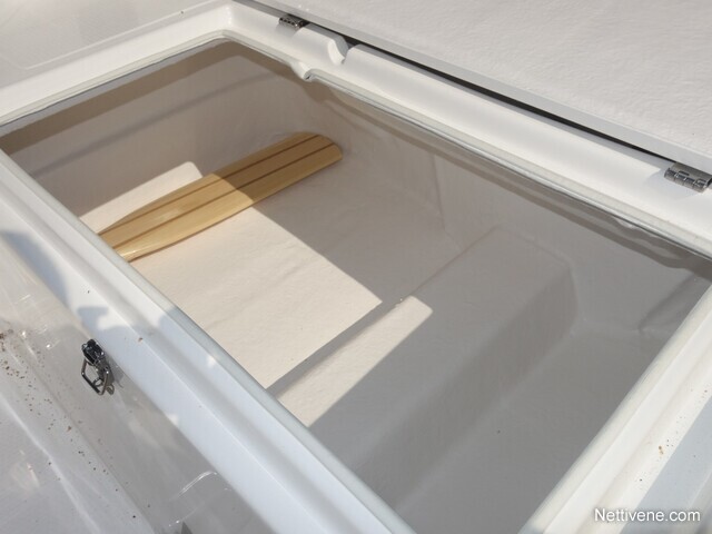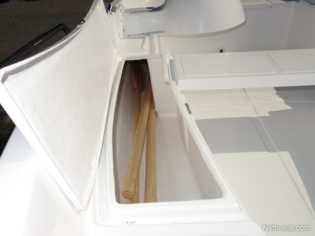 Sivulla isot ja pitkä säilytystila johon mahtuu airot ja uistelusaitat. Sekä lisäksi keulassa iso tila kuin myös takapenkinalla tila todella iso.