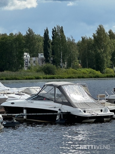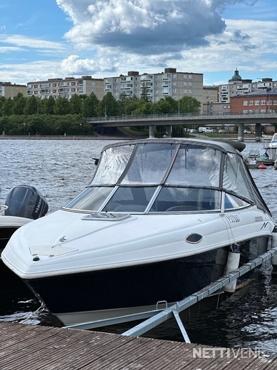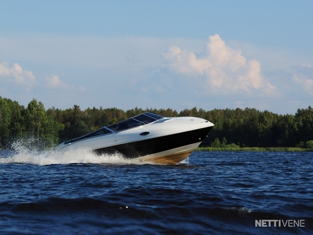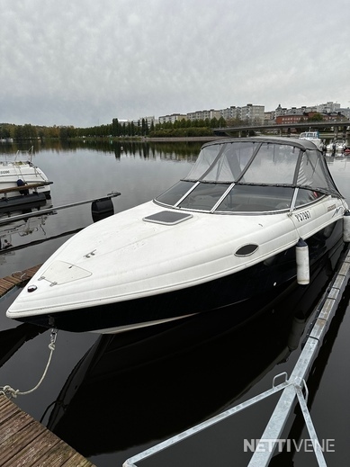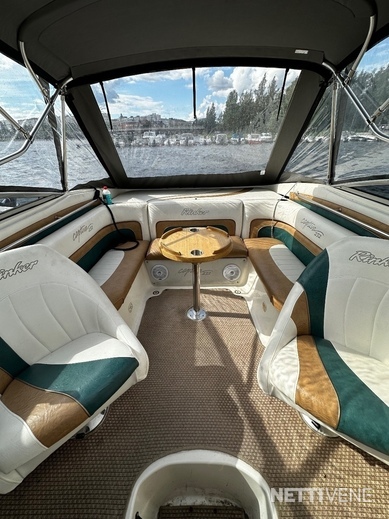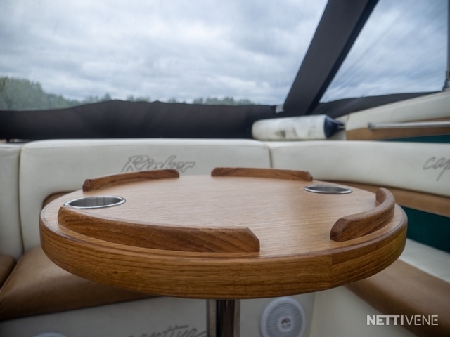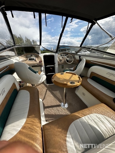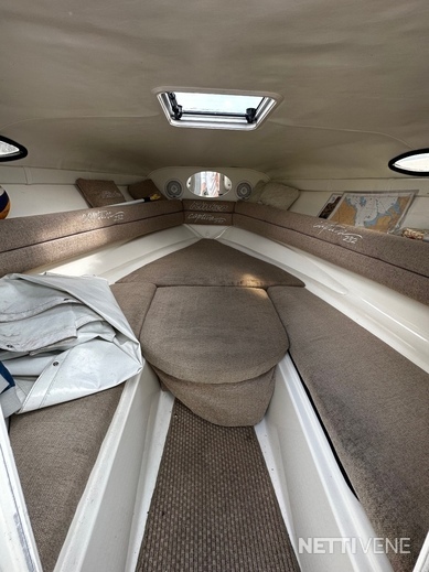 Lisäksi pari vuotta sitten uusitut lasien tummennukset sekä ajokuomu, joka teetetty vimpan päälle VA-varusteella kolmisen vuotta sitten. Verhoilut on niin ikään uusittu kertaalleen, joten lookki ei ole sellainen ”ysäri” niinku monessa muussa yli 15 vuotta vanhassa jenkkiveneessä. Varusteina mm. varsin asialliset popit ja VHF-radio. Kivasti säilytystilaa.