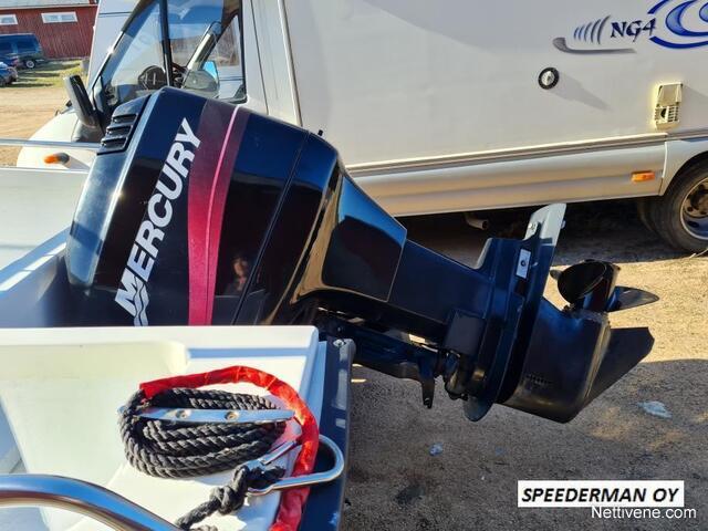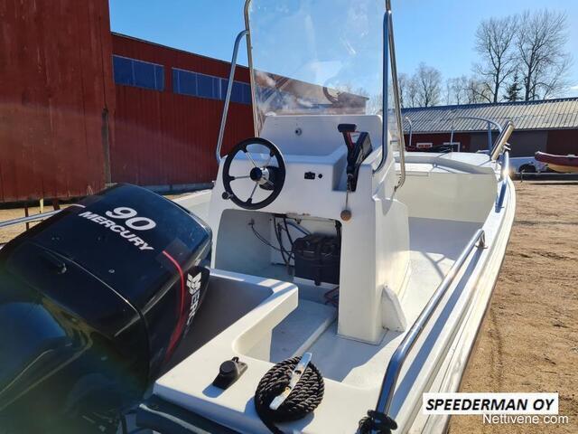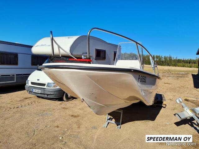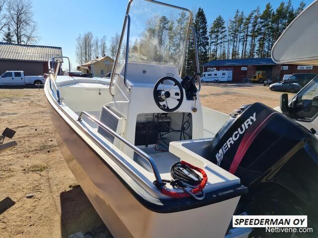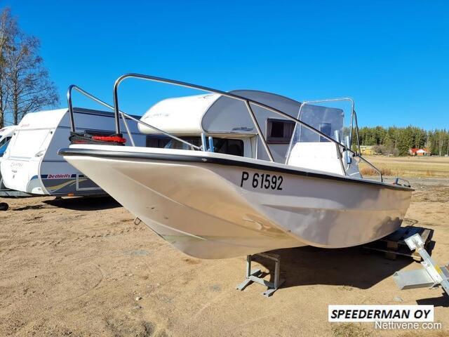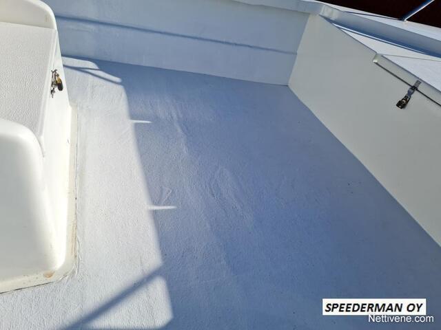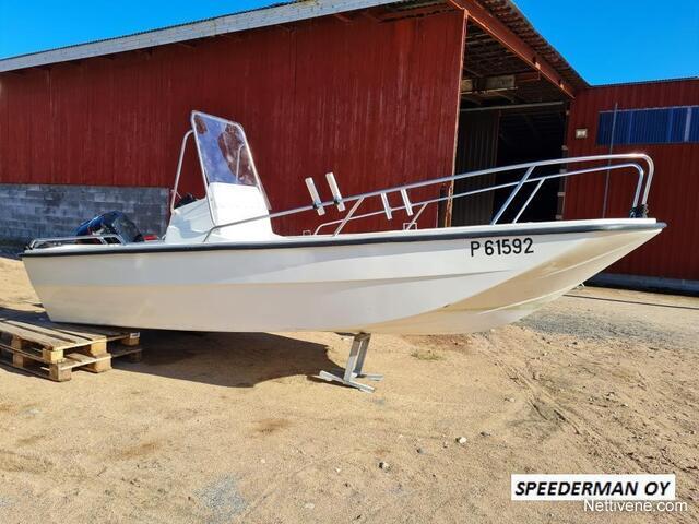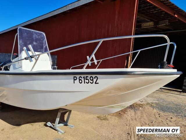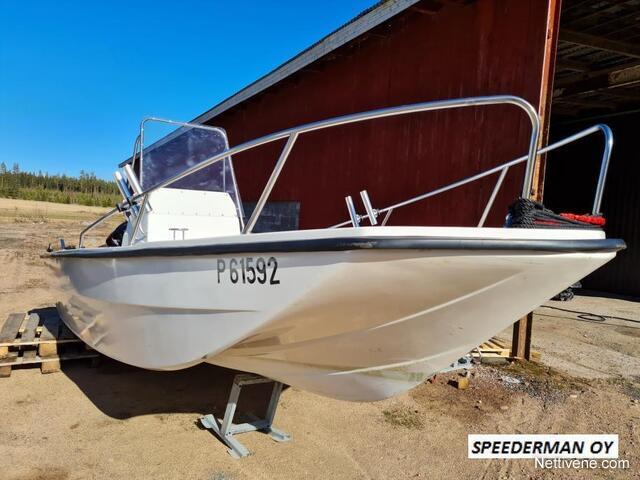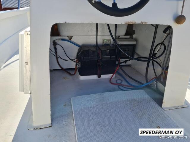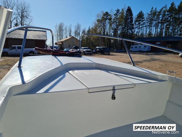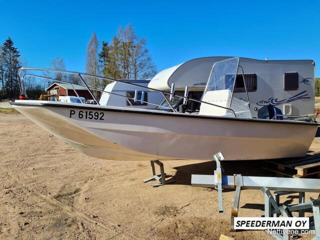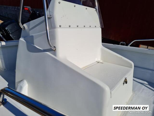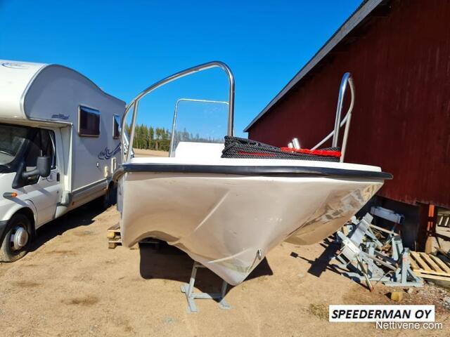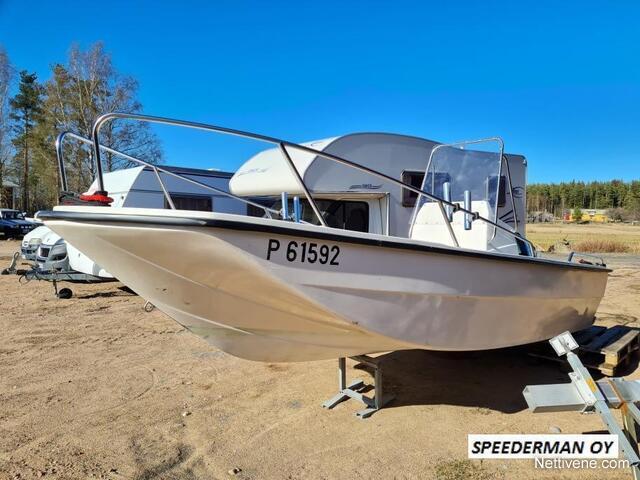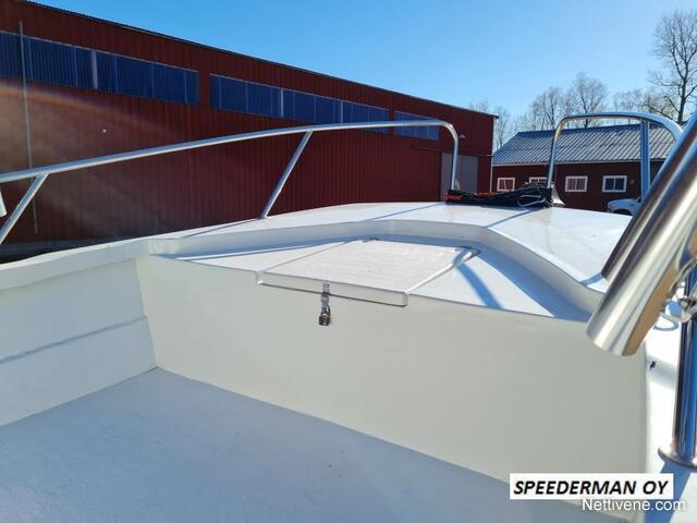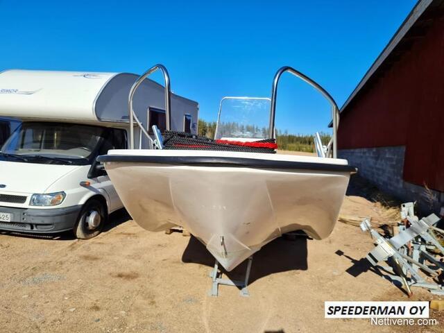 Elikkä kokeilumielessä myyntiin itselleni rakennettu lasikuitu vene. On tehty ihan mattotavarasta, ei ole puhallettu kuitu. Pohja on Jurmo Trimaranin muotista tehty ja kannen muotti on isäni kädenjälkeä. Pohjan vuoksi on todella vakaa vene, ei juuri heilu vaikka isoja ukkoja pyörii ympäri venettä useampia. Materiaalissa ei ole säästelty. pohjan paksuus todella järeä. etukoukun kohdalta mitattu 24mm. Tälläistä tilaa ja vakautta mitä tämä tarjoaa tässä koossa ei muusta suomalaisesta lujitemuovi paatista saada. Ihanteellinen heittolavetti, lattian korkeus on niin ylhäällä että mistä vaan pystyy heittämään. Näitä on valmistettu suomeen vain 11kpl, toki räätälöitynä kunkin tyyliin, eli ei yhtään samanlaista vastaan tule. Kysymyksiä saa ja pitää esittää. Tilaa löytyy säilytykseenkin todella hyvin. pohjan ja lattian välissä on luukusta 4 lihalaatikon mentävä tila. Ensimmäiseen kysymykseen vastaus tuosta W pohjan muodosta jo etukäteen, Ei hakkaa aallokossa niin paljon mitä voisi olettaa. Kuskille itselleen ei hakkaa lainkaan, mutta varmasti se normaaliin pohjaan nähden enemmän silti ottaa aaltoon kyydissä istuville. Vene on talviteloilla tällä hetkellä kotiphalla. Moottori on hyvin huollettu joka vuosi. Sinkit, siipipyörät, öljyt vaihdettu. Viimevuonna vaihdettu potkuri pykälän isompaan. Tänä vuonna säädetty ajotukset synkronoitu kaasarit ja putsattu. Lähtee todella nätisti käymään. Tunneista ei tietoa, entisellä omistajalla ollut vähäisellä käytöllä järvellä. Vene on itsestään tyhjentyvä sadevedestä. Aurinkopaneeli lataussäätimineen kuuluu kauppaan. myös 2x 30l erillistankkia pikaliittimillä ja takaiskulla mukaan. Aurinkopaneeli mahdollistaa esimerkiksi kylmälaukun pitämisen eco tilassa käytössä koko ajan reissulla päällä ilman pelkoa että akku loppuisi ja luotain voi olla päällä. Tankki on aina näppärä ottaa mukaan ja tankata huoltoasemalla. Vauhti tuolla moottorilla noin 33 Solmua. Ei tosiaan siis vaadi näin järeää konetta tähän, jos pienempää nelaria tilalle tulevaisuudessa meinaisi. Tänä vuonna asennettu myös uusi ultraflex hydrauliohjaus. Rekisteröity 200hv moottoriin saakka.