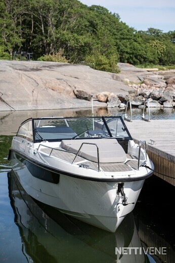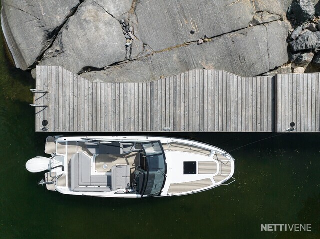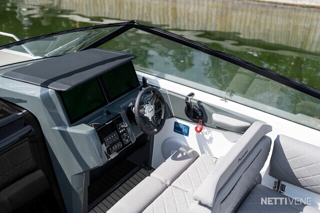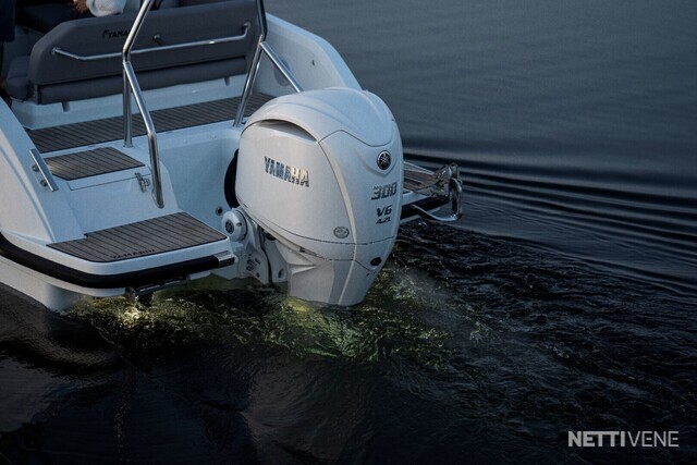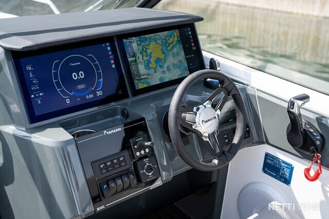 Yamarin Q -älynäyttö on kiinteä osa venettä, samoin Yamahan F300 V6-perämoottori. Vakiovarusteena on yksi 16" Q-näyttö elektronisilla Navionics-kartoilla, lisävarusteena näytön saa tuplattua.