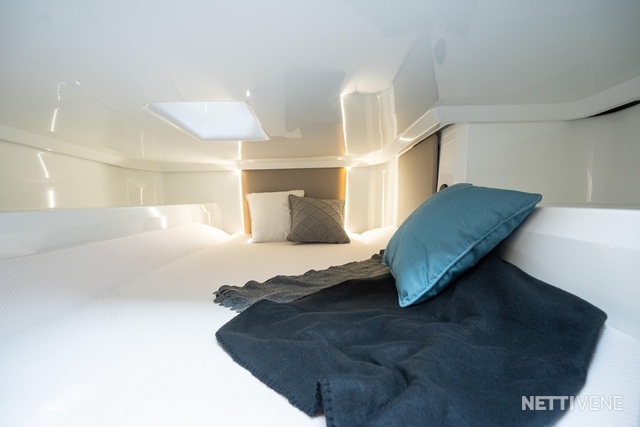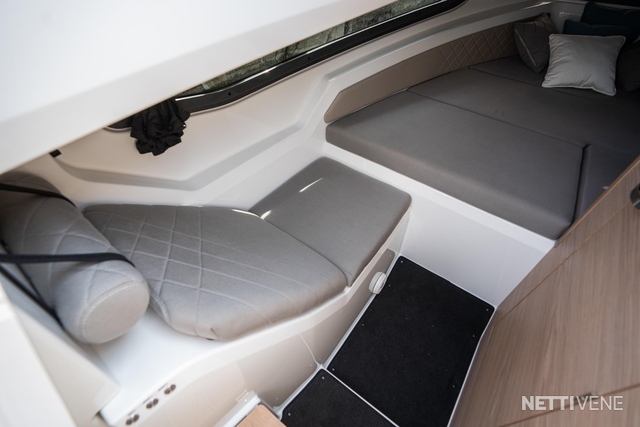 Keulassa on avara makuukajuutta, joka on suurten runkoikkunoiden ansiosta hyvin valoisa. Kannella on lisäksi avattava luukku, josta on helppo laskea tavarat suoraan keulahyttiin. Paapuurin puolella kulkusyvennyksen alla on mukava divaani, josta avautuvat upeat näkymät ulos vieressä olevasta runkoikkunasta. Lisäksi keulassa on erillinen, tilava wc. Keulakajuutasta on pääsy myös avotilan alle sijoittuvaan toiseen tilavaan makuukajuuttaan, jossa kaksi aikuista yöpyy mukavasti.