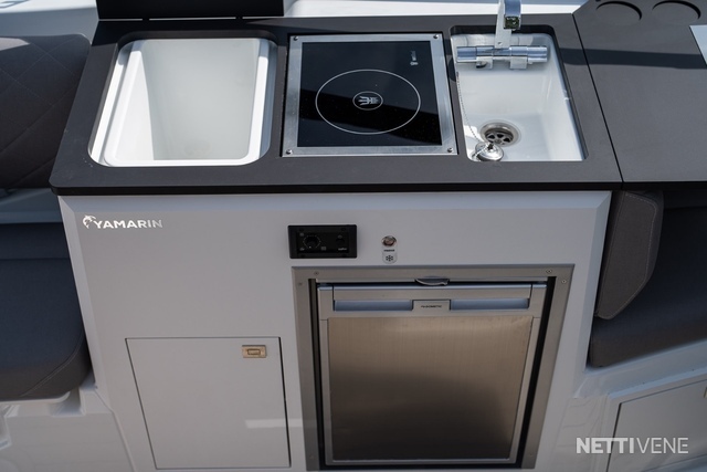 Yamarin Q -älynäyttö on kiinteä osa venettä, samoin Yamahan F300 V6-perämoottori. Vakiovarusteena on yksi 16" Q-näyttö elektronisilla Navionics-kartoilla, lisävarusteena näytön saa tuplattua.
