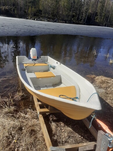 Hyväkuntoinen suomi vene toissavuonna maalattu ja vahvistettu parilta kohdalta. Uudet airot ja 5hp suzuki moottori. Kuvat viime keväältä nyt moottori tallissa vielä ja vene rantatrailerilla.