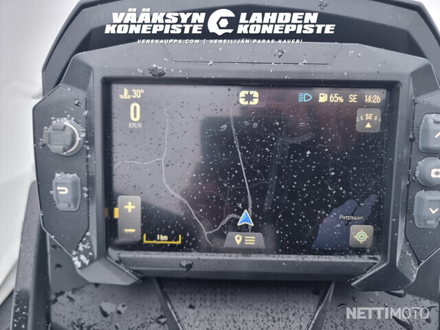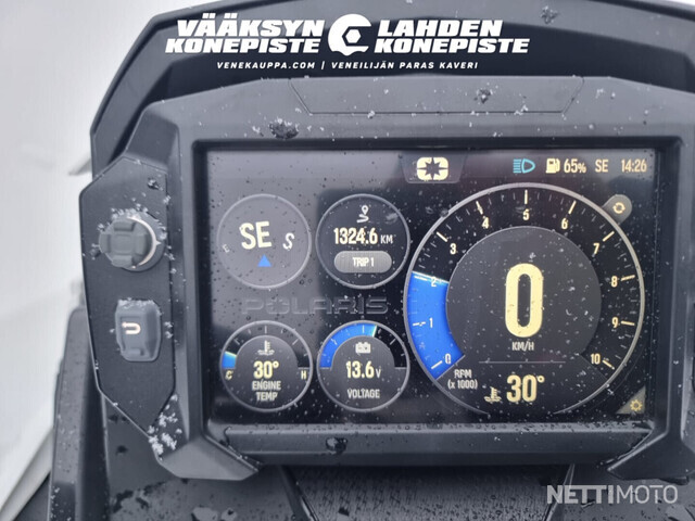 Uutta vastaava Polariksen XCR 850 Indy isolla värinäytöllä jossa Navi. Kelkassa myös sähköstartti ja varahihna paikallaan.