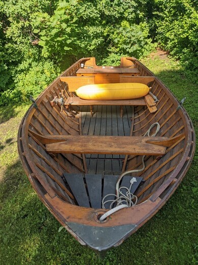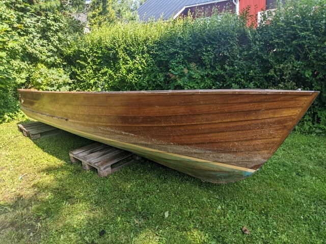Mahonkinen puuvene ratilla ja irrotettavalla turkilla, airot, sekä moottori -60 luvulta