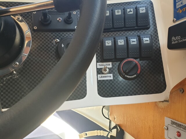 Varusteita: Radio, meri-vhf laitteet, Takakannella merivesisuihku mm. kalansaaliiden pesuun, Autopilotti kaukosäädöllä, Kaukohallinta laite myös takakannella sekä mahdollisuus siirtää Garmin plotteri takakannelle tarvittaessa, Garmin ja Raymarine plotterit kosketusnäytöillä sekä Garmin tutka, Canon fishawk x4 bluetooth, Kompassi, pimennysverhot, vapatelineitä riittävästi, Kölirauta, katolla valonheitin, Trimmilevyt, keulatikkaat, Plaanarikelat mastoilla.