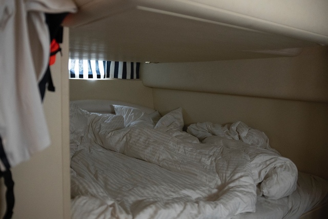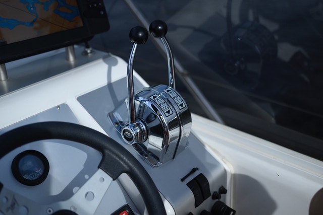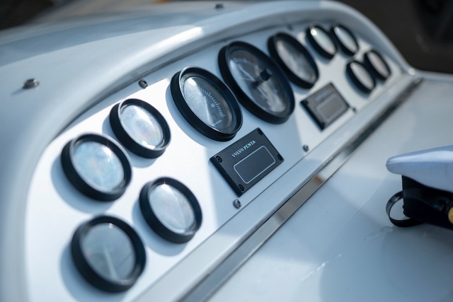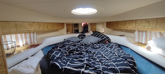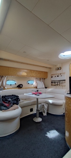 As shown in the photos, the interior is finished to a high standard with refined attention to detail. A guest cabin with a double bed is located at the rear, while the master bedroom is positioned at the bow. The yacht features a spacious bathroom with separate shower, and a fully equipped galley – everything you need is on board. Surfaces are finished in cherry wood veneer, light leather upholstery, and stone countertops. Thanks to the wide beam, both the interior and the helm station offer generous space and comfort. A high-end sound system provides immersive audio throughout the entire vessel.